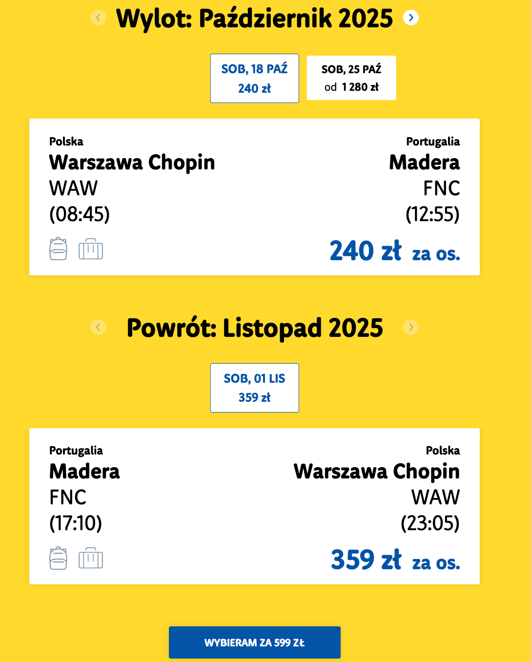 Пример бронирования билетов из Варшавы на Мадейру за 140 евро (599 злотых) туда-обратно (2 или более билетов) :
