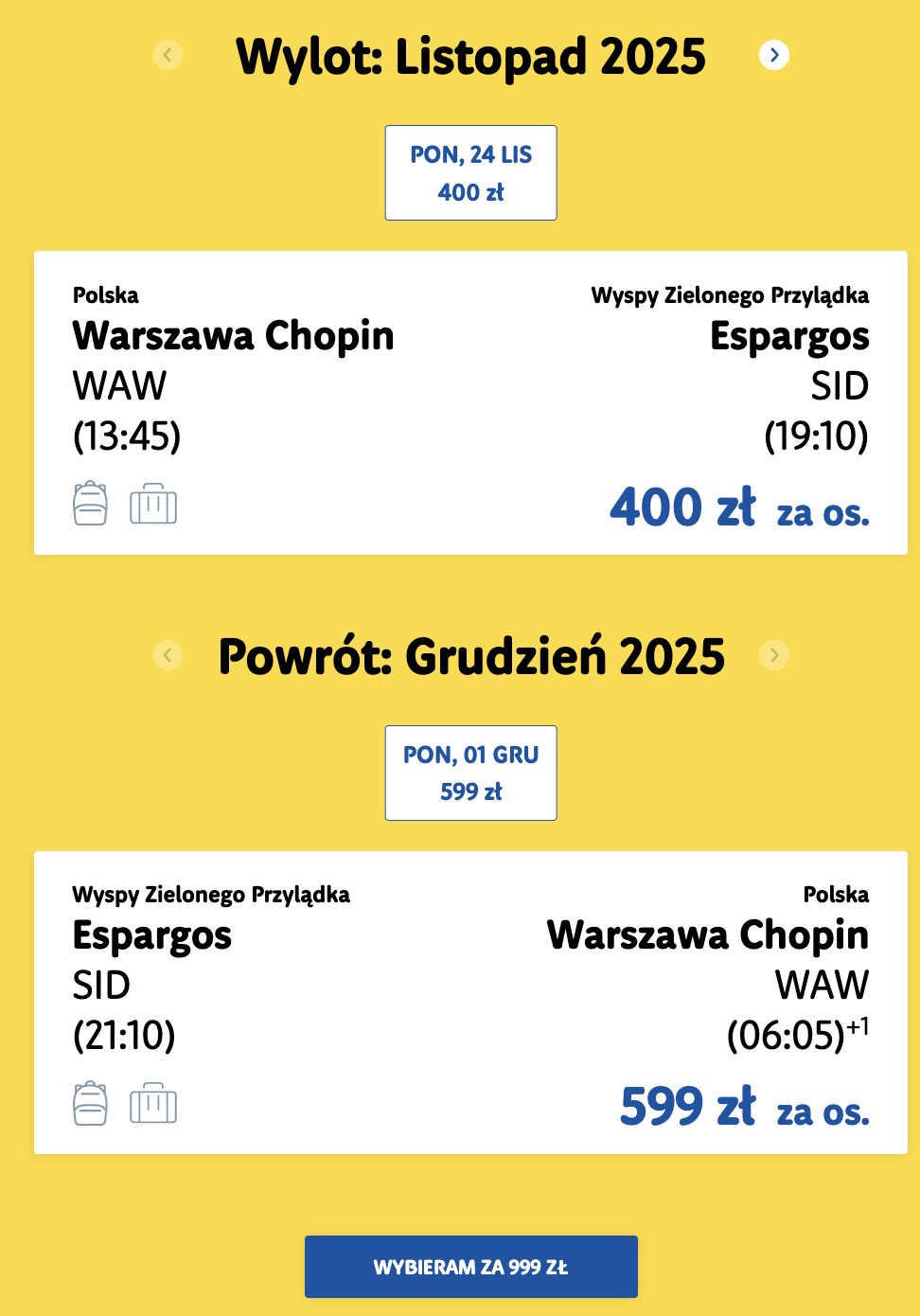 Пример бронирования билетов Варшава — Эшпаргус (остров Сал, Кабо-Верде) за 235 евро (999 злотых) туда-обратно 24 ноября — 1 декабря (2 или более билетов):