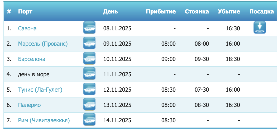 7-дневный круиз из Савоны в Рим кругом через Марсель, Барселону, Ла-Гулет (Тунис) и Палермо в ноябре 2025 года.