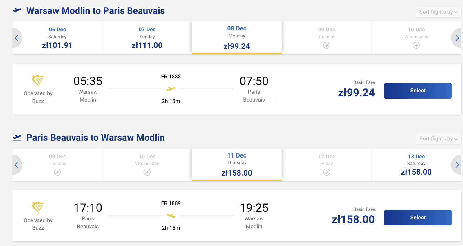Пример бронирования билетов из Варшавы Модлин в Париж Бове за 23 евро (99 злотых) в одну сторону или за 60 евро (258 злотых) туда-обратно: