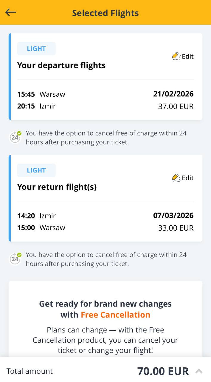 Пример бронирования Варшава-Измир-Варшава за 70 евро туда-обратно: