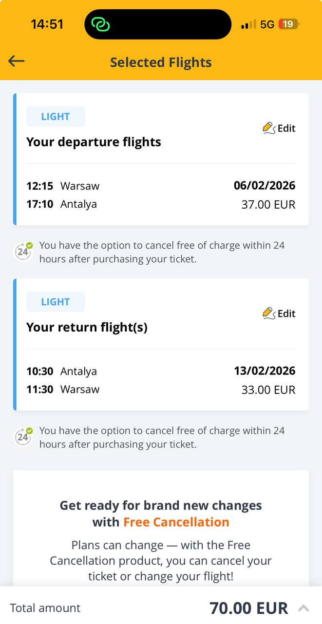 Пример бронирования Варшава-Анталья-Варшава за 70 евро туда-обратно: