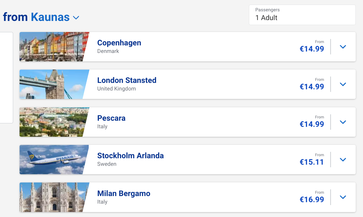 Пример бронирования билетов из Каунаса по 15 евро в одну сторону: