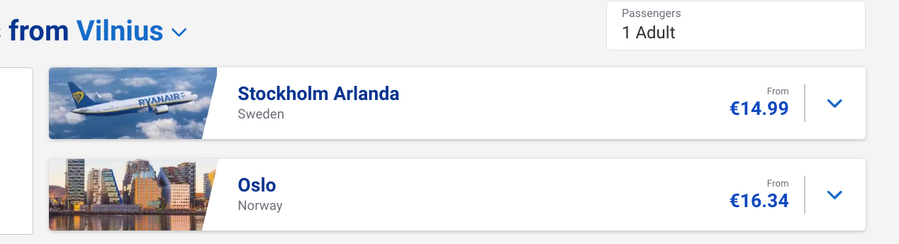 Пример бронирования билетов из Вильнюса от 15 евро в одну сторону: