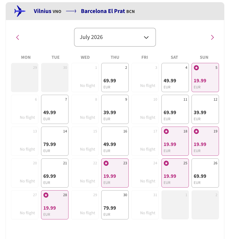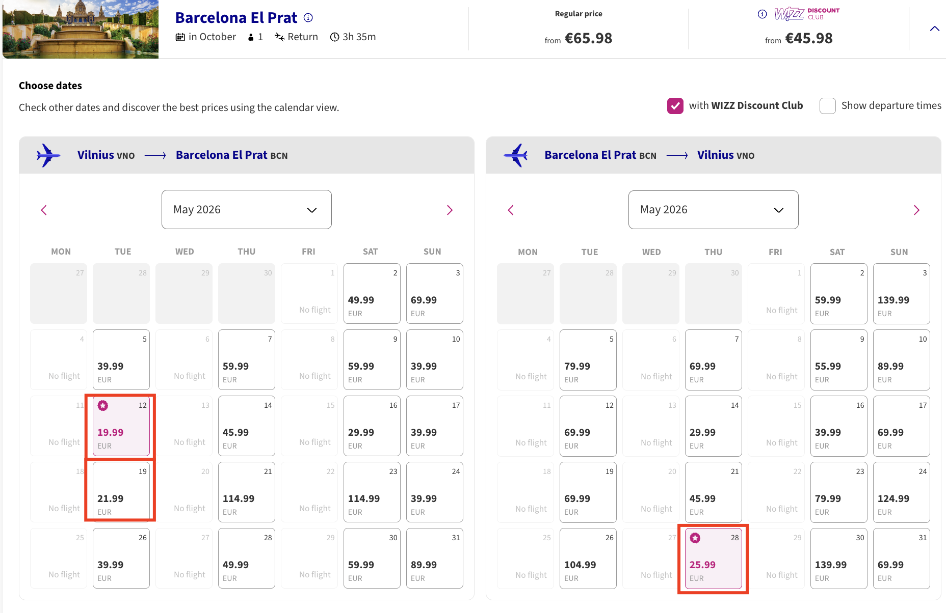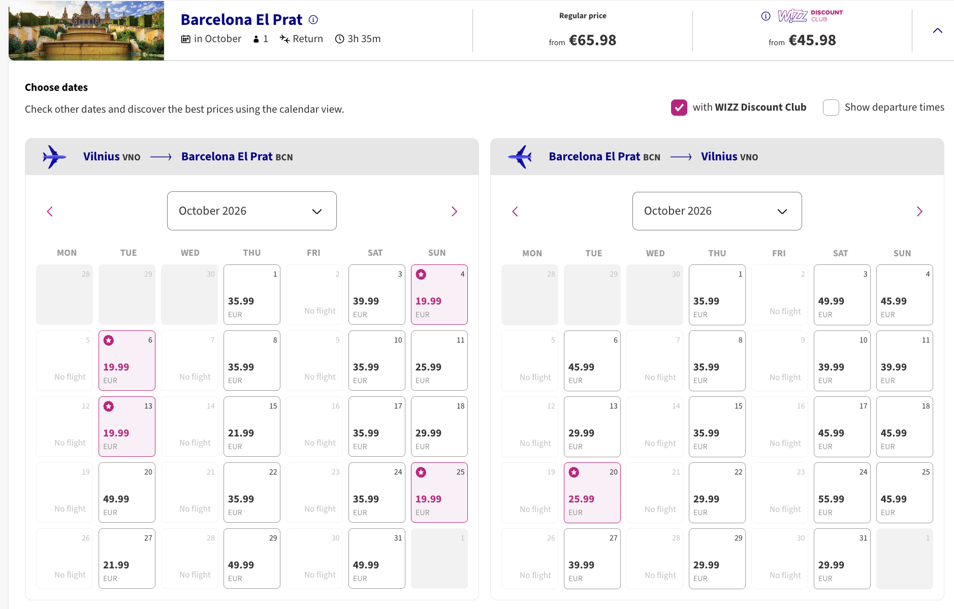 Весной-осенью можно слетать из Вильнюса в Барселону прямыми рейсами Wizz Air всего от 26 евро в одну сторону. Для членов клуба WDC дешевле всех!