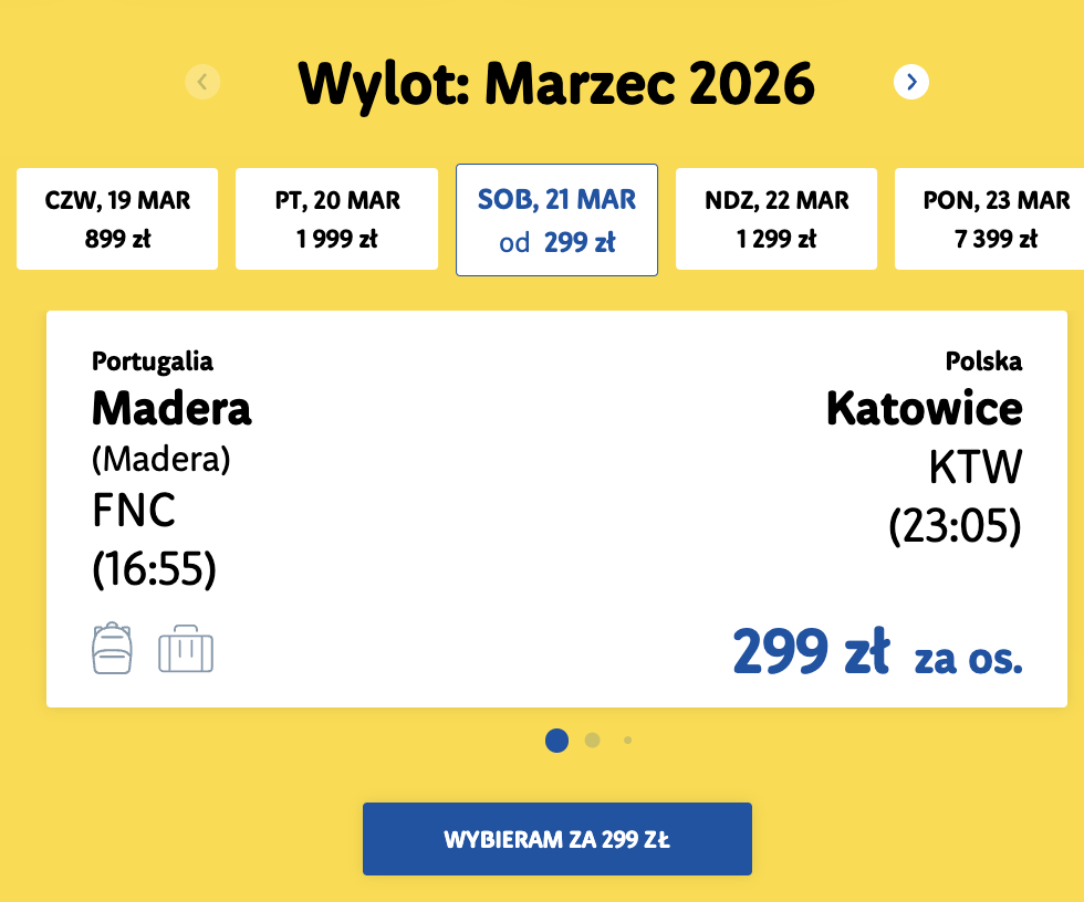 Пример бронирования билетов Мадейра-Катовице за 70 евро (299 злотых) в одну сторону 21 марта: