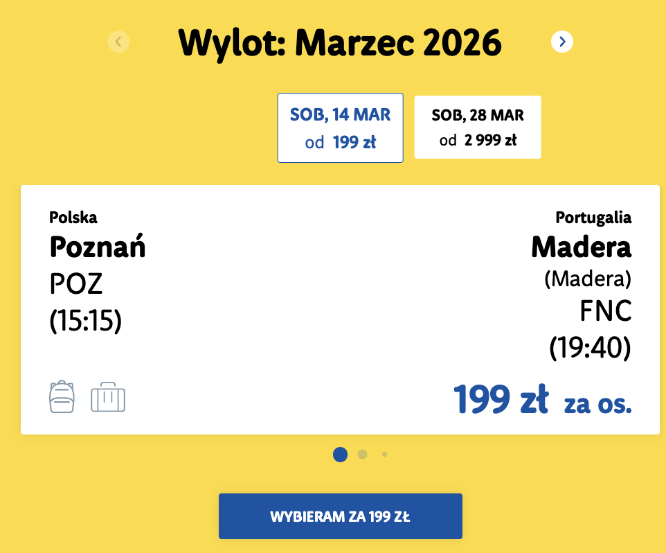 Пример бронирования билетов Познань-Мадейра за 46 евро (199 злотых) в одну сторону 14 марта: