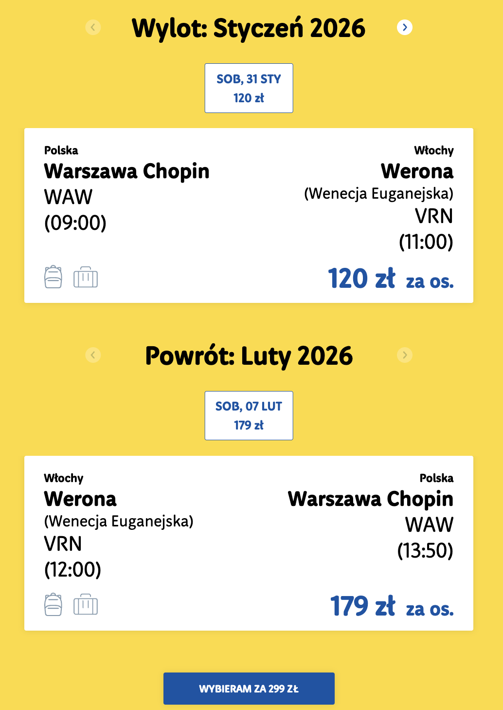 Пример бронирования билетов из Варшавы в Верону 31 января — 7 февраля за 71 евро (299 злотых) туда-обратно (2 или более билетов) :