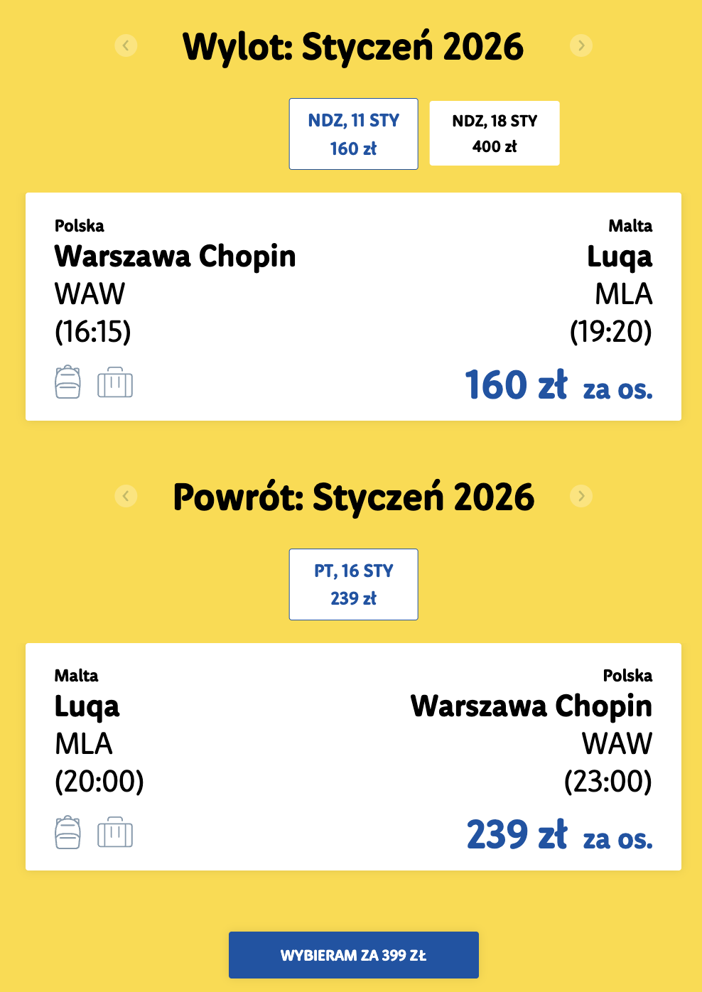 Пример бронирования билетов из Варшавы в Мальту 11 — 16 января за 70 евро (399 злотых) туда-обратно (1 билет) :