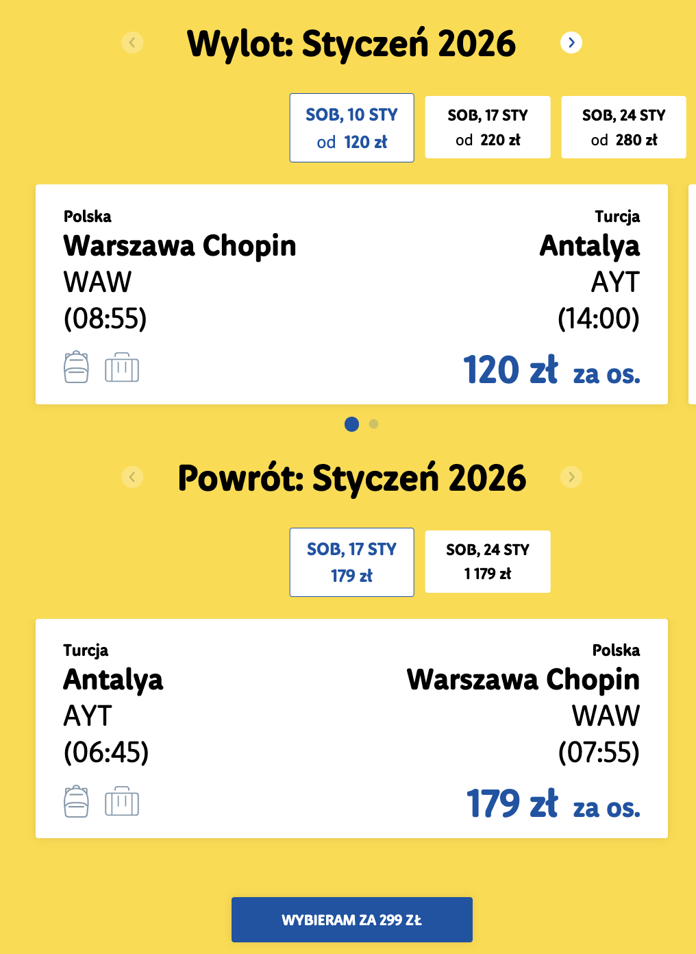 Пример бронирования билетов из Варшавы в Анталью 10 — 17 января за 70 евро (299 злотых) туда-обратно (2 или более билетов) :