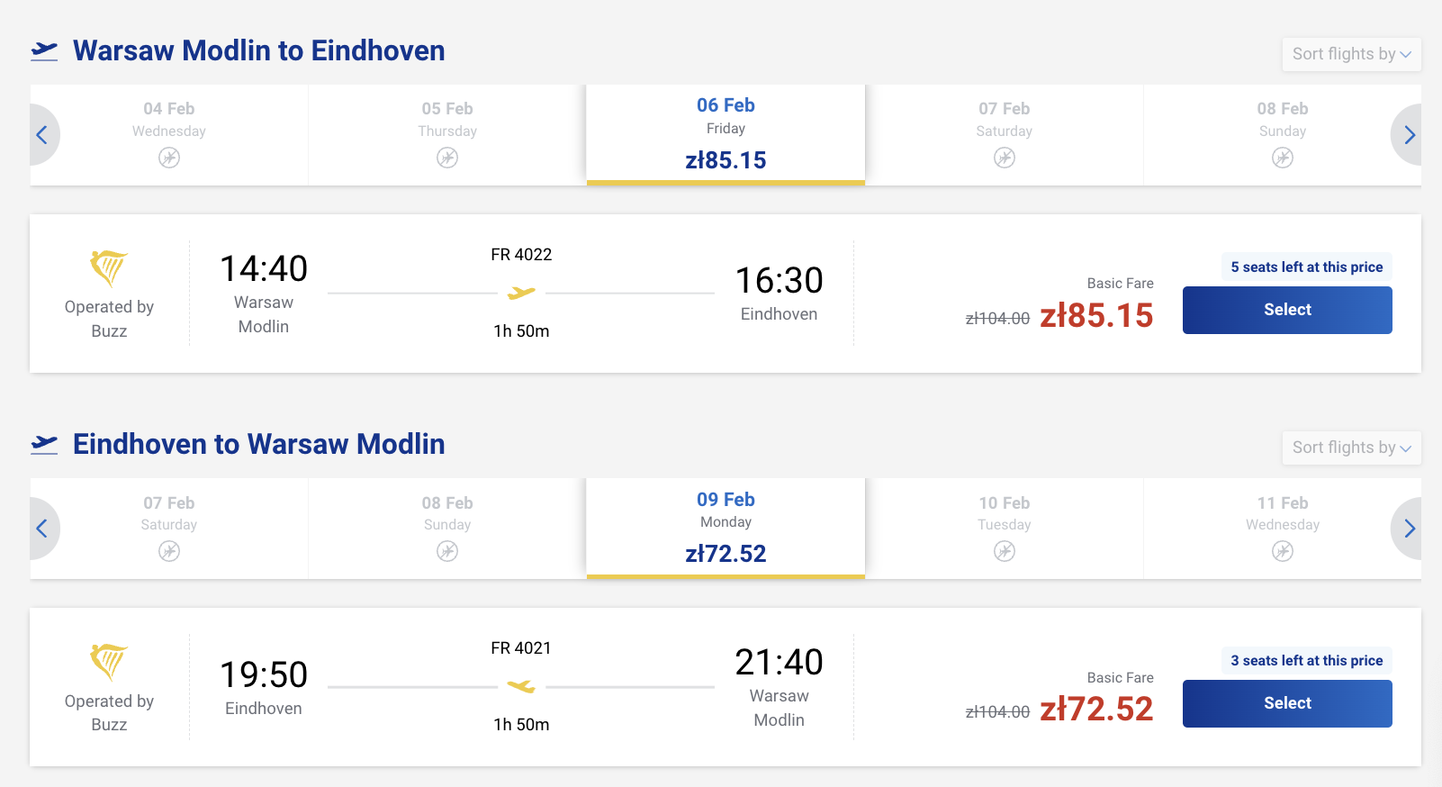 Пример бронирования авиабилетов Варшава (Модлин) — Эйндховен за 38 евро (160 злотых) туда-обратно: