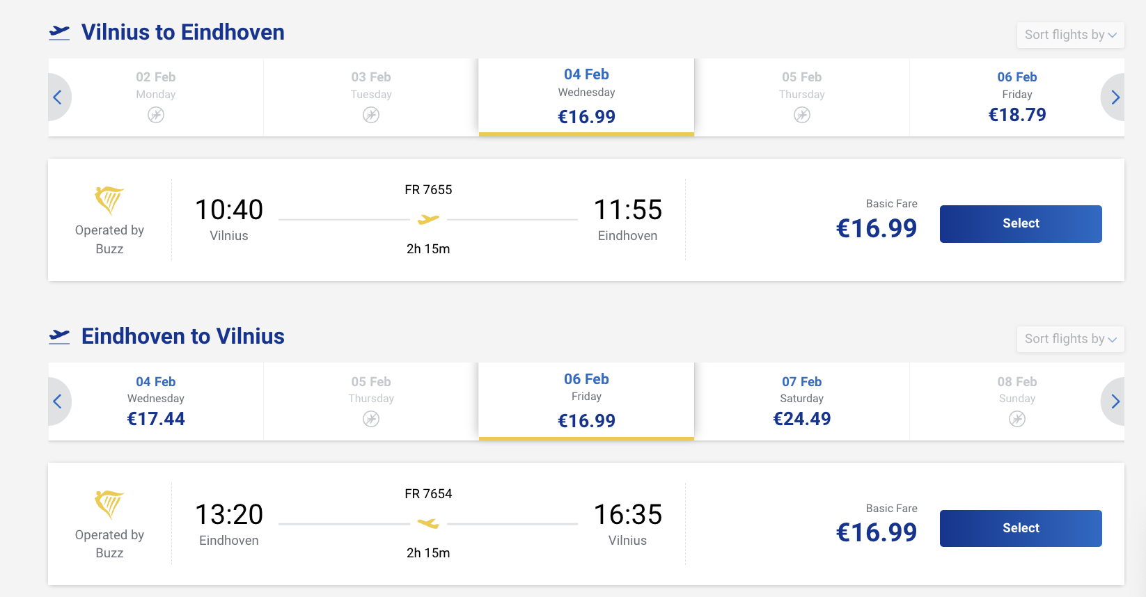 Пример бронирования авиабилетов Вильнюс — Эйндховен за 34 евро туда-обратно (даты можно двигать и лететь на большее кол-во дней при желании) :