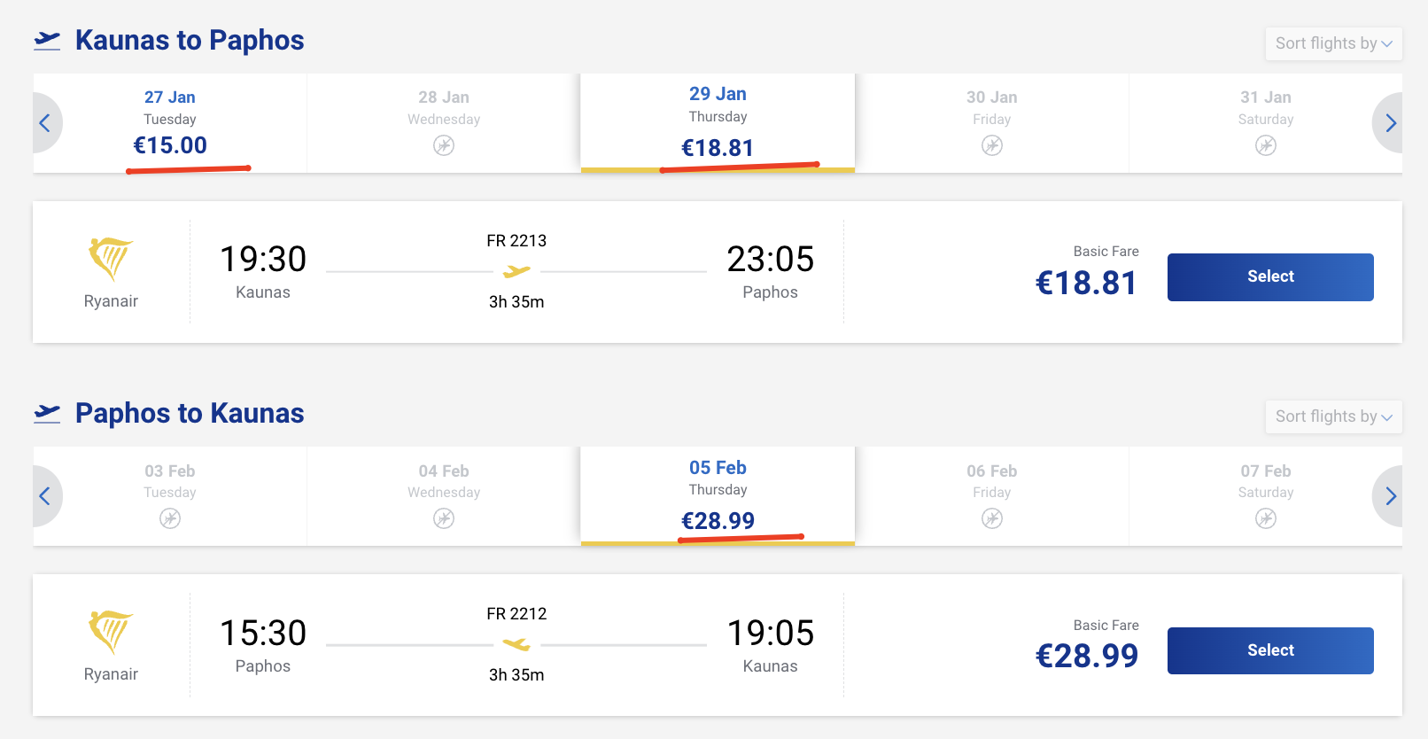 Ryanair предлагает авиабилеты из Каунаса (Литва) в Пафос (Кипр) всего от 19 евро в одну сторону январе-феврале.