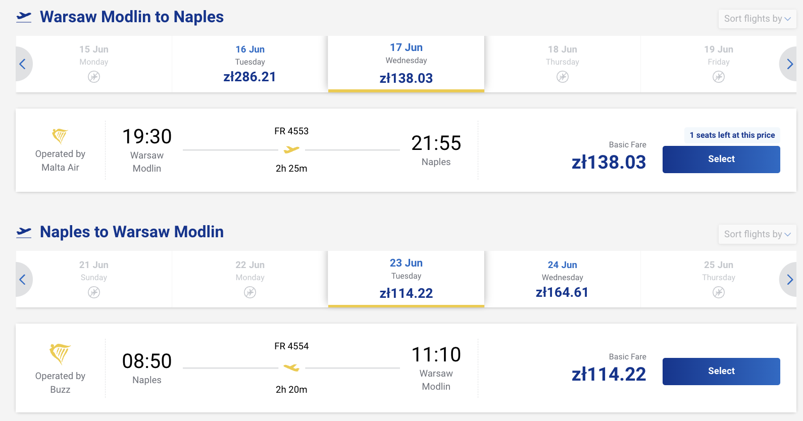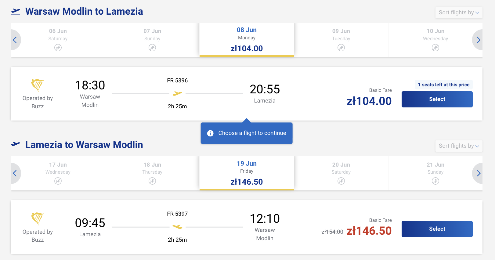 Пример бронирования авиабилетов за 24 евро (104 злотых) в одну сторону и за 59 евро (250 злотых) туда-обратно: