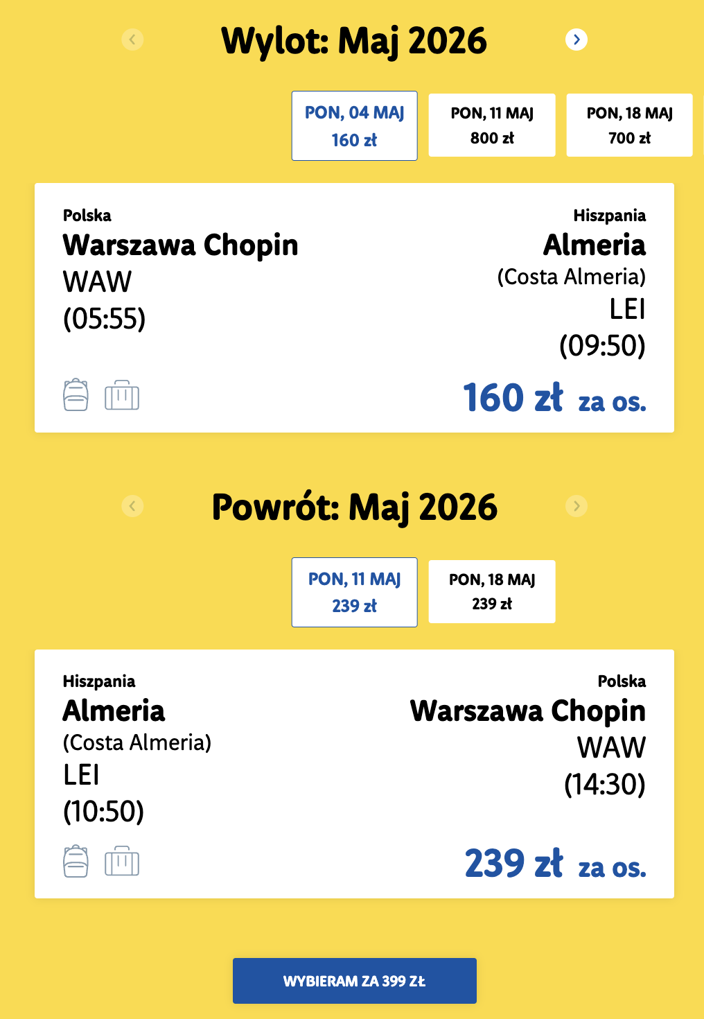 Пример бронирования билетов из Варшавы в Алмерию 4-11 мая за 94 евро (399 злотых) туда-обратно (2 или более билетов) :