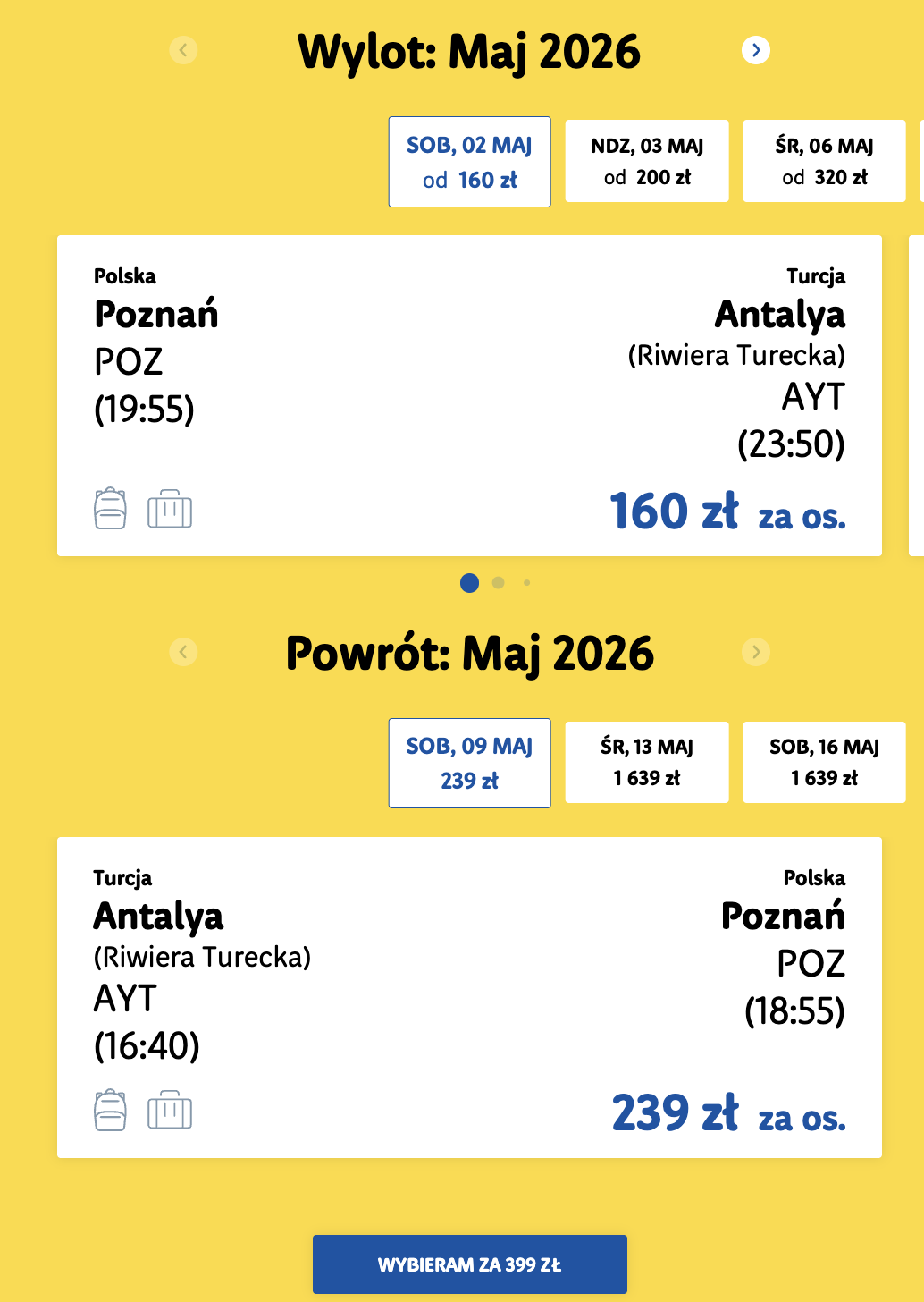 Пример бронирования билетов из Познани в Анталью 2-9 мая за 94 евро (399 злотых) туда-обратно (2 или более билетов) :