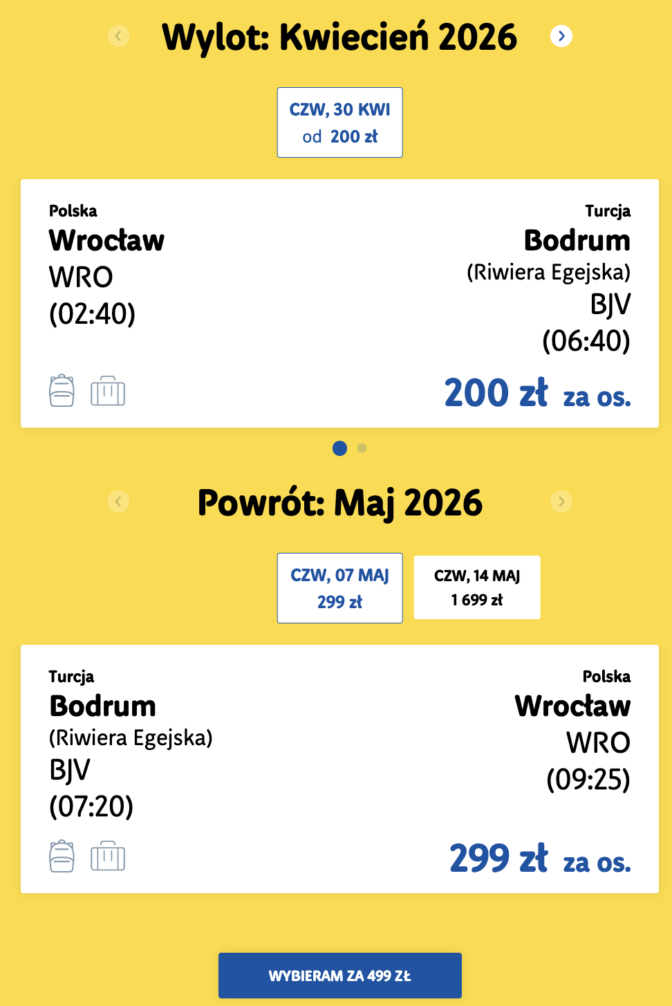 Пример бронирования билетов из Вроцлава в Бодрум 30 апреля — 7 мая за 117 евро (499 злотых) туда-обратно (2 или более билетов) :