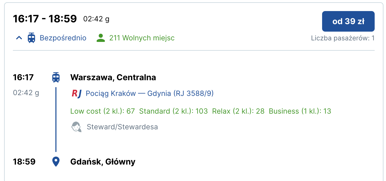 Пример бронирования билетов из Варшавы в Гданьск от 39 злотых (9 евро) в одну сторону: