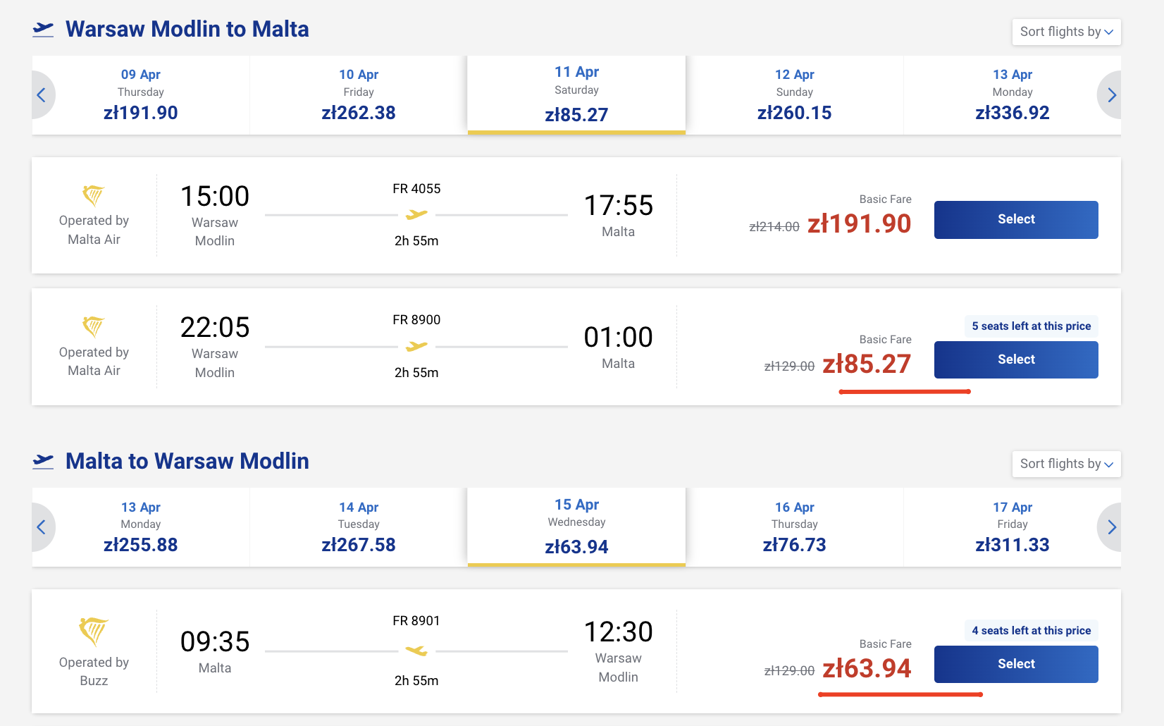 Пример бронирования авиабилетов из Варшавы (Модлин) на Мальту за 35 евро (150 злотых) туда-обратно: