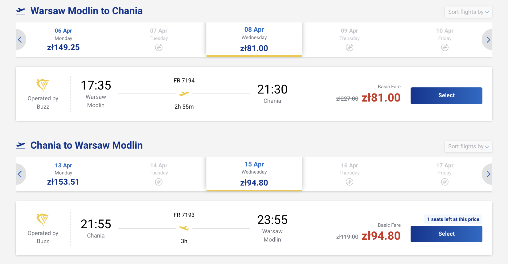 Пример бронирования авиабилетов из Варшавы (Модлин) на Крит за 41 евро (175 злотых) туда-обратно: