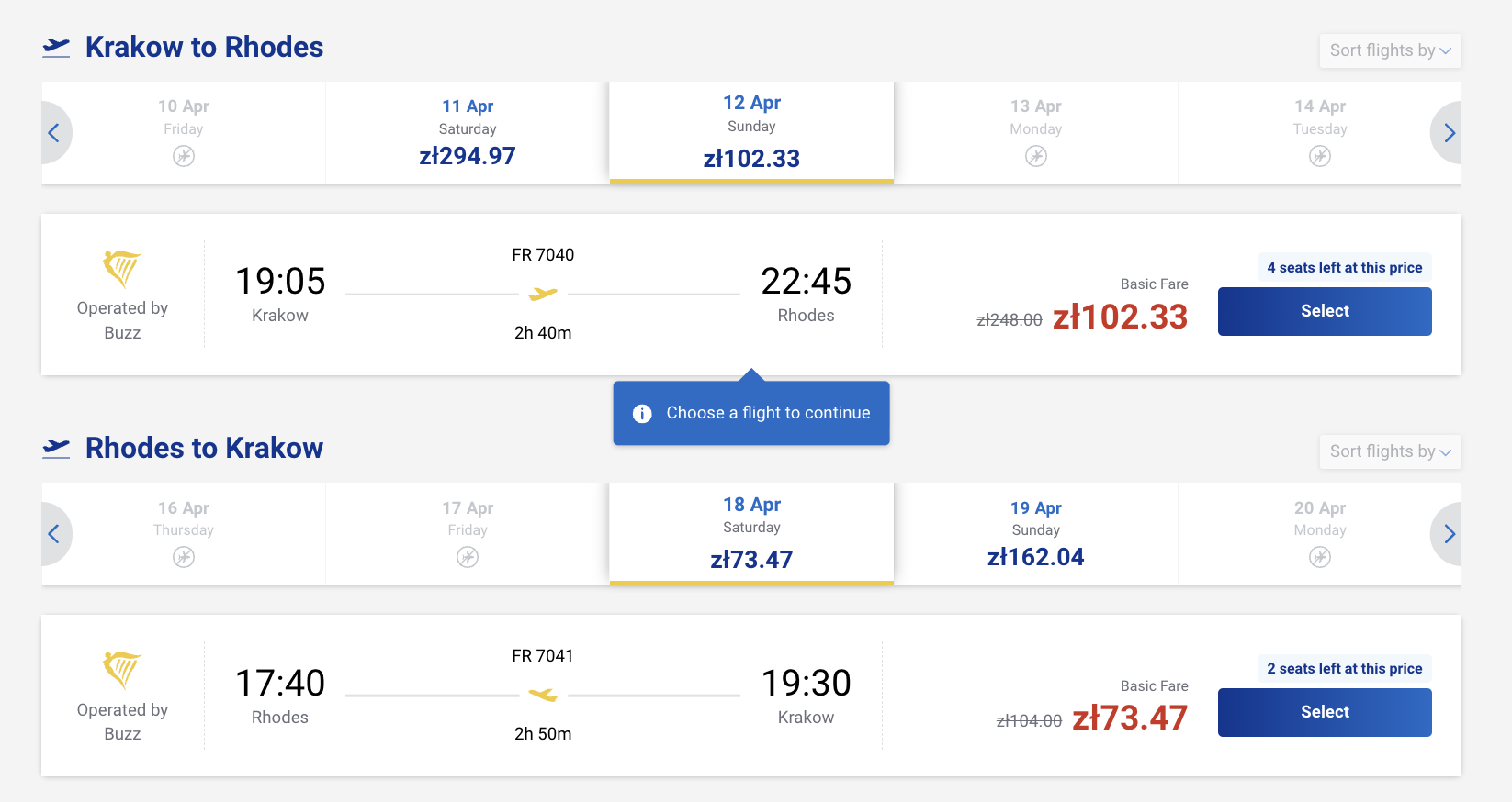 Пример бронирования авиабилетов из Кракова на Родос за 41 евро (175 злотых) туда-обратно: