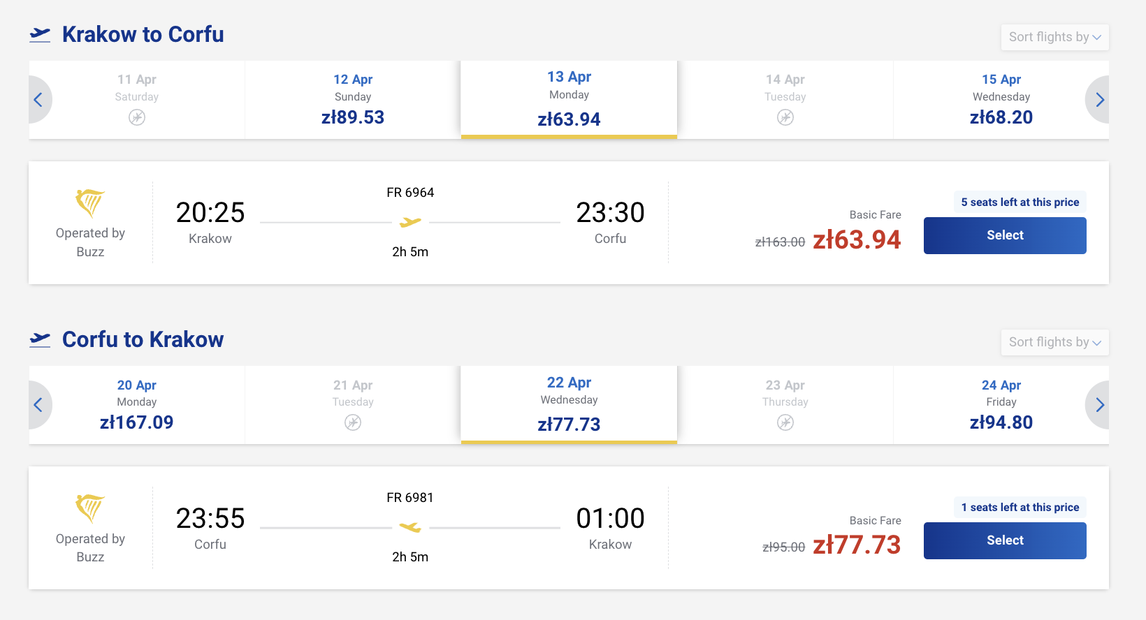 Пример бронирования авиабилетов из Кракова на Корфу за 33 евро (140 злотых) туда-обратно:
