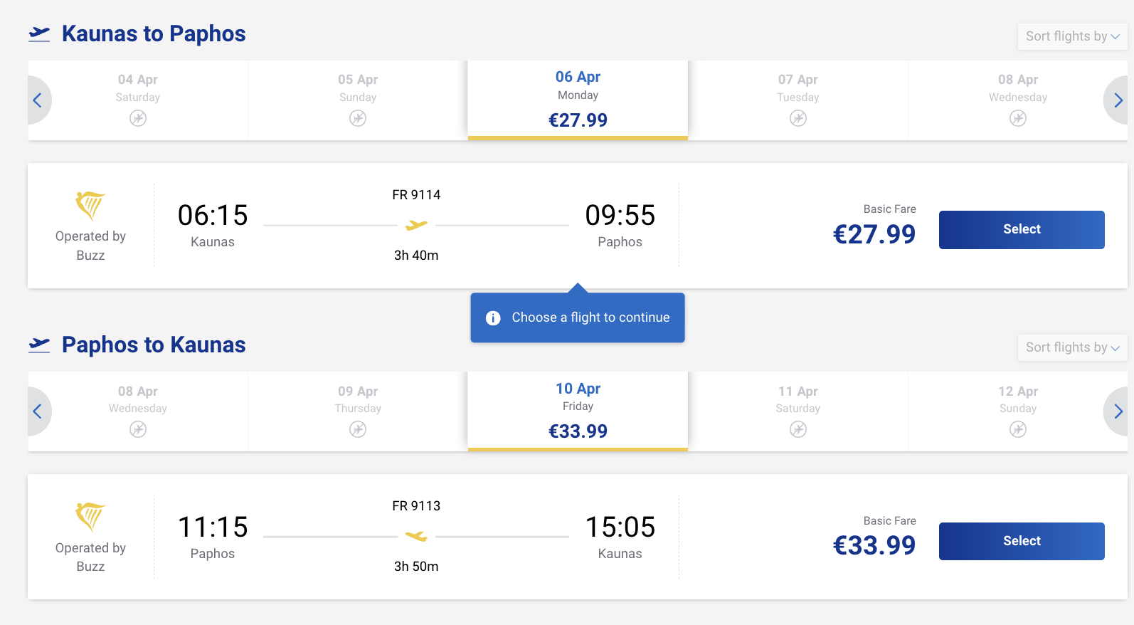 Пример бронирования авиабилетов из Каунаса на Кипр за 62 евро туда-обратно: