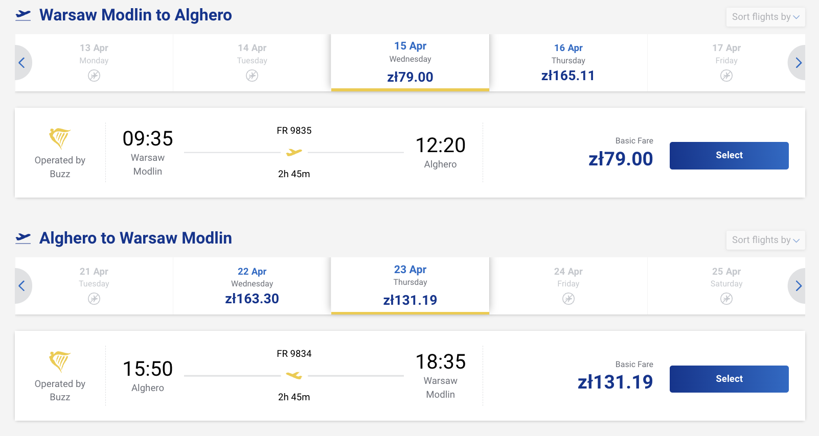 Пример бронирования авиабилетов за 19 евро (79 злотых) в одну сторону и за 50 евро (210 злотых) туда-обратно: