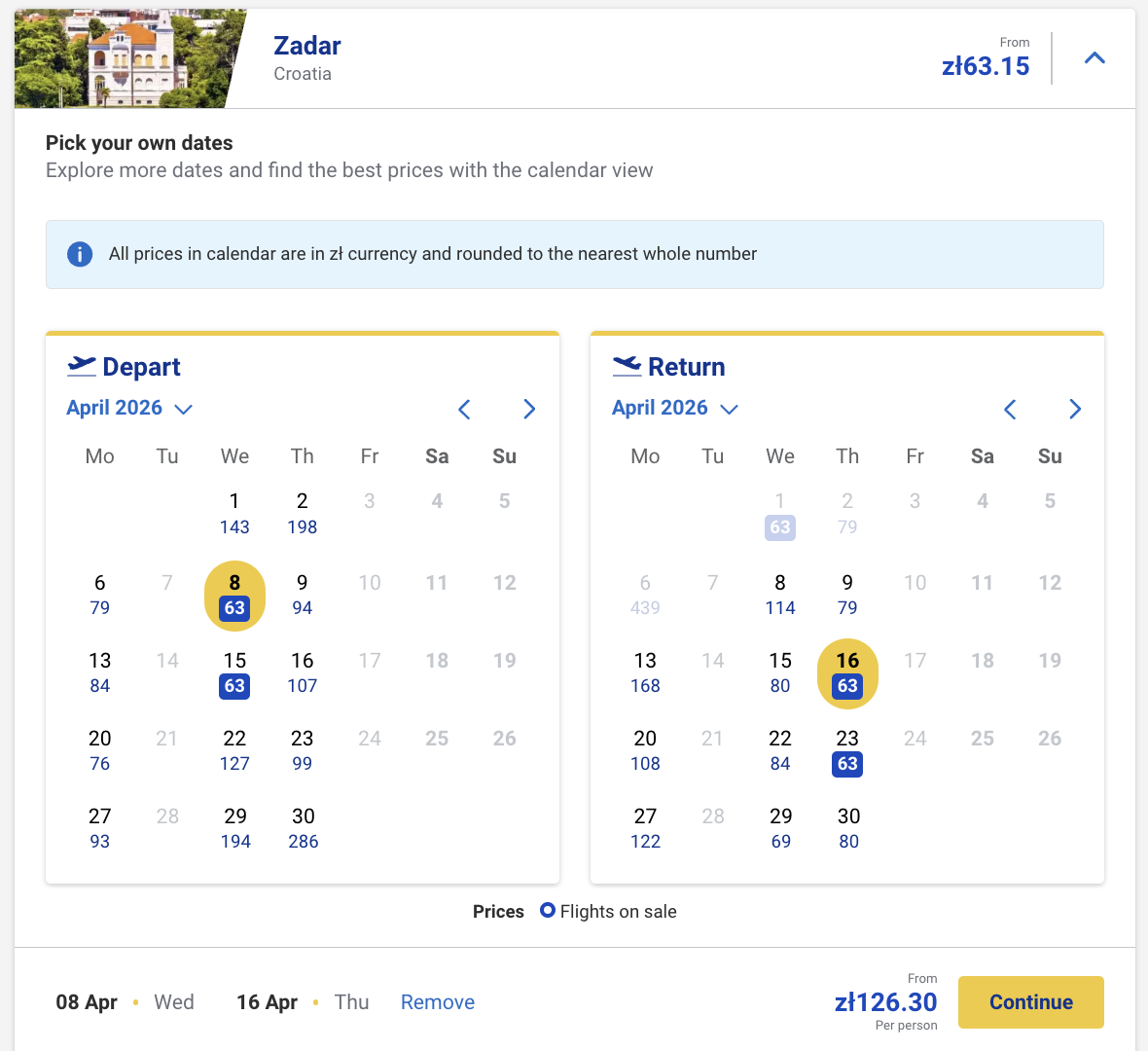 Пример бронирования авиабилетов Гданьск-Задар за 15 евро (63 злотых) в одну сторону и за 30 евро (126 злотых) туда-обратно:
