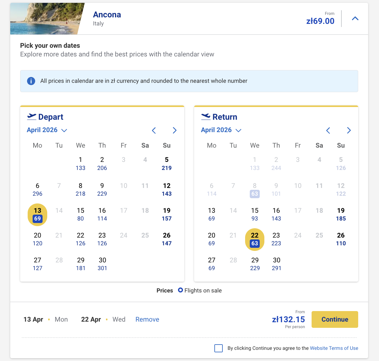 Пример бронирования авиабилетов Краков-Анкона за 16 евро (69 злотых) в одну сторону и за 32 евро (138 злотых) туда-обратно: