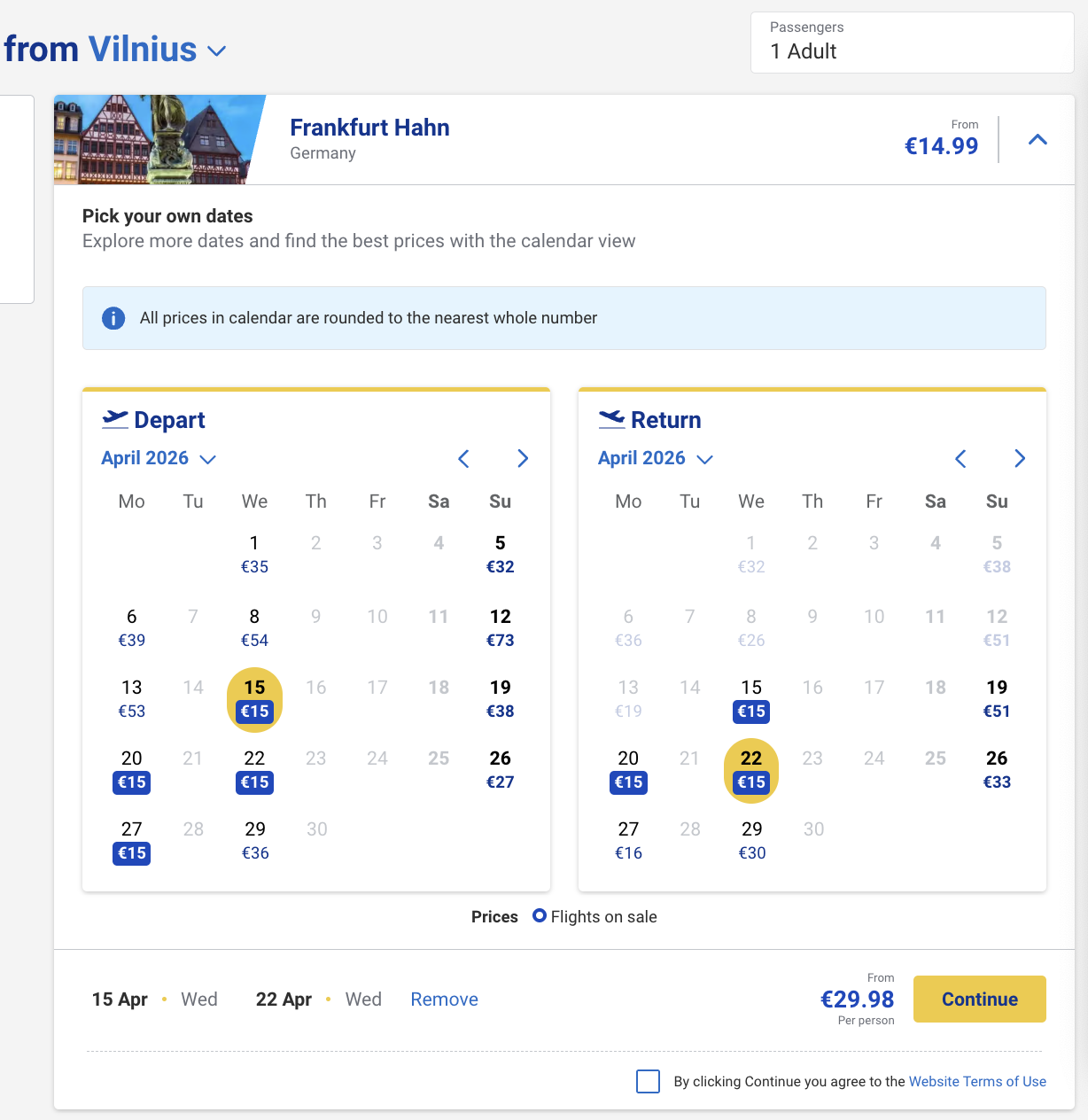 Пример бронирования авиабилетов Вильнюс — Франкфурт Ханн за 15 евро в одну сторону и за 30 евро туда-обратно: