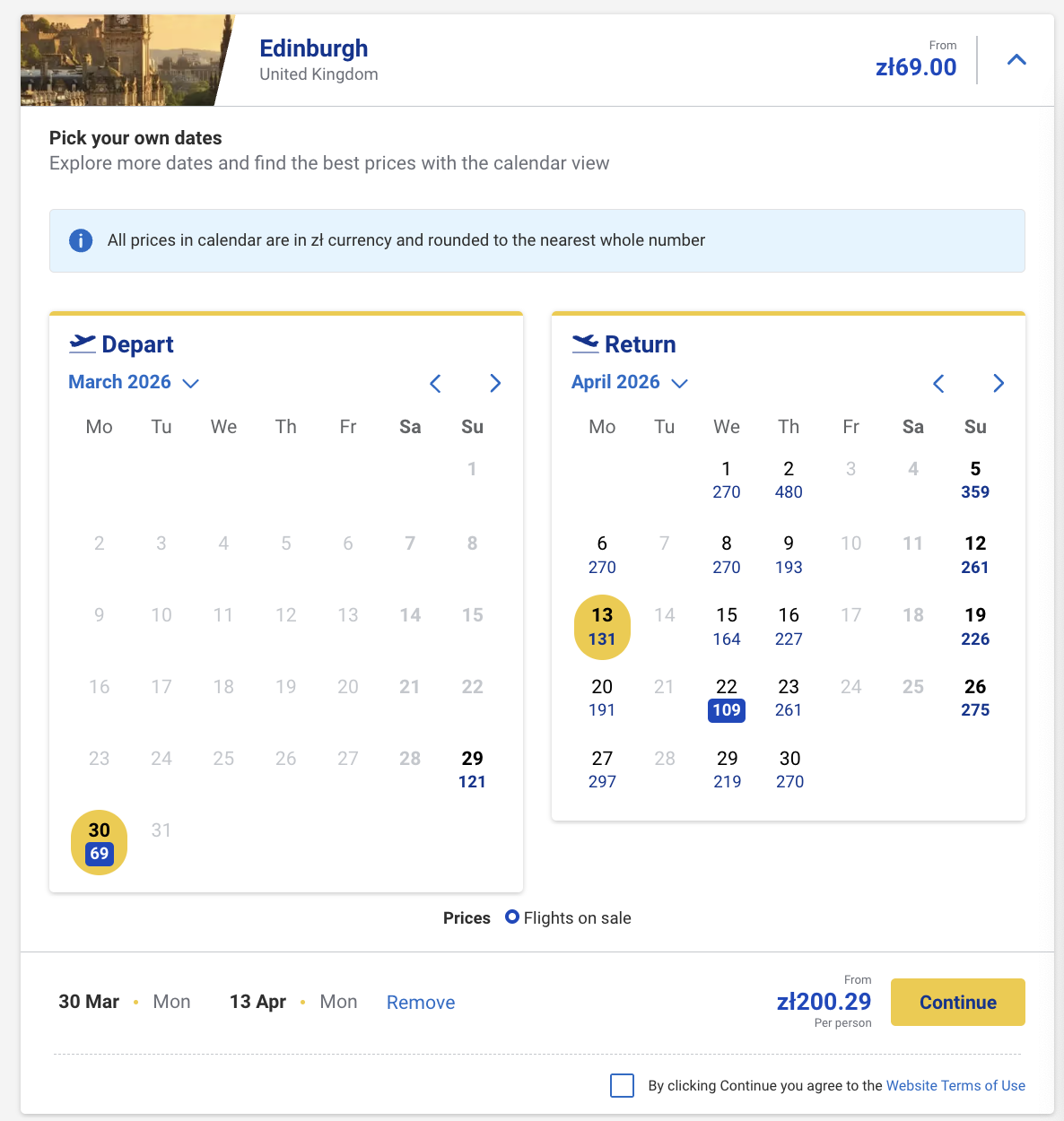 Пример бронирования авиабилетов Варшава-Эдинбург за 16 евро (69 злотых) в одну сторону и за 47 евро (200 злотых) туда-обратно: